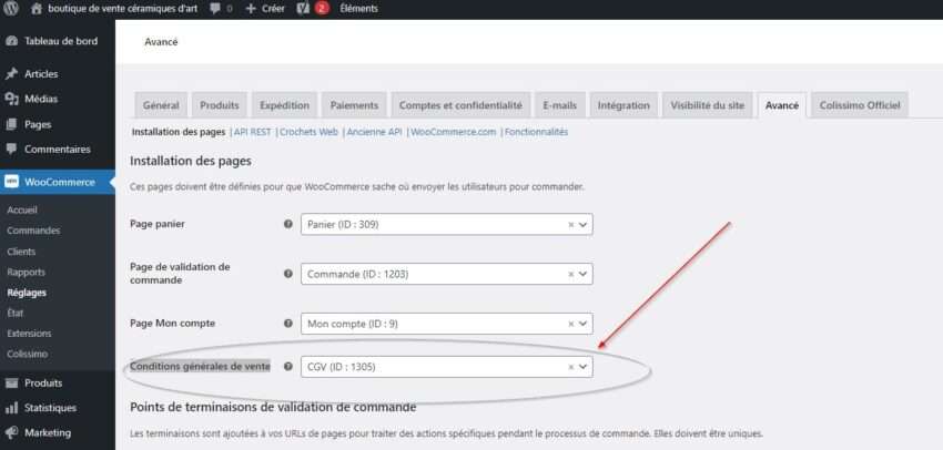 • Dans la combo box : Conditions générales de vente, ajoutez la page « CGV » crée au préalable