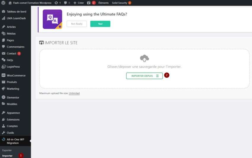 Sur le site de destination, allez dans All-in-One WP Migration > Importer.